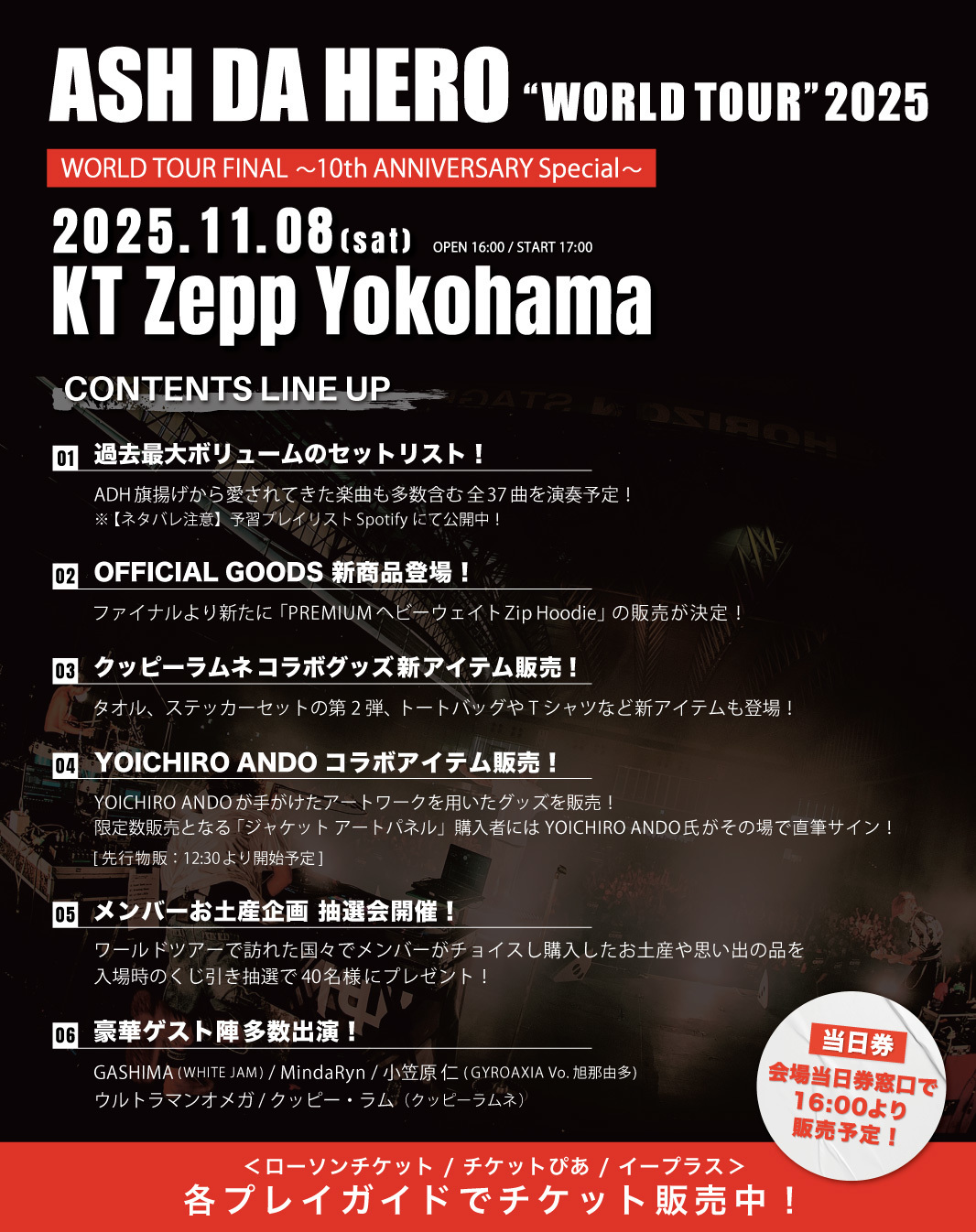 11月8日横浜公演では、ASH DA HEROワールドツアーファイナル & 旗揚げから10周年となるメモリアルイヤーとして、ソロ時代の楽曲コーナーやゲストアーティストも多数出演!
